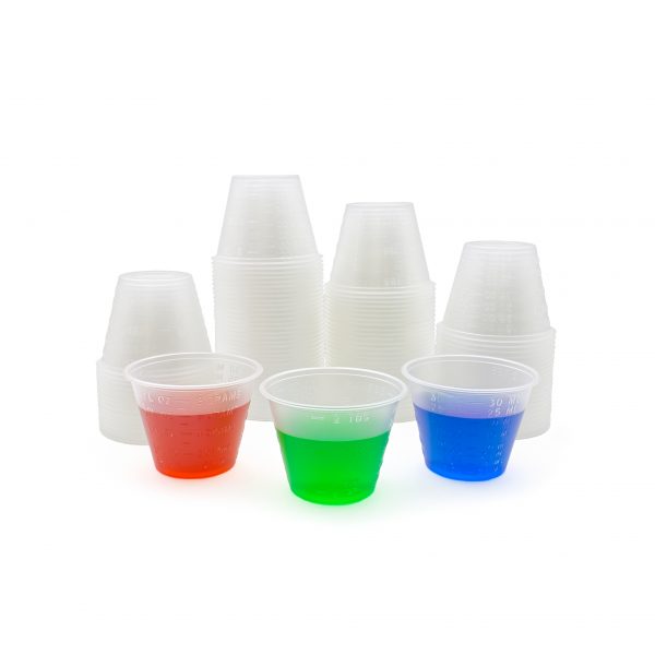 1oz graduated plastic measuring medicine cups made of #5 recyclable polypropylene.